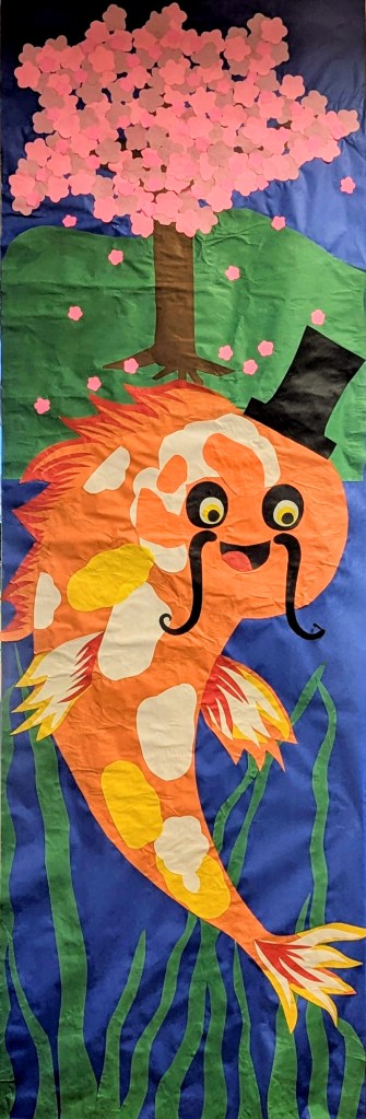 Originally I was going to make 7 of these “part real, part imaginary” banners because there are 7 columns but already there is a giant sun? sunflower? occupying one of them and I think it’s possible I might be asked to create a large Dewey Decimal System poster for another, plus it’s time to change out the bulletin boards and then comes the mad rush to lay out the literary journal and get that to the printer’s so it’s ready for the release party, immediately after which I’m going to Chicago to present my new comic book at the American Literary Association convention.