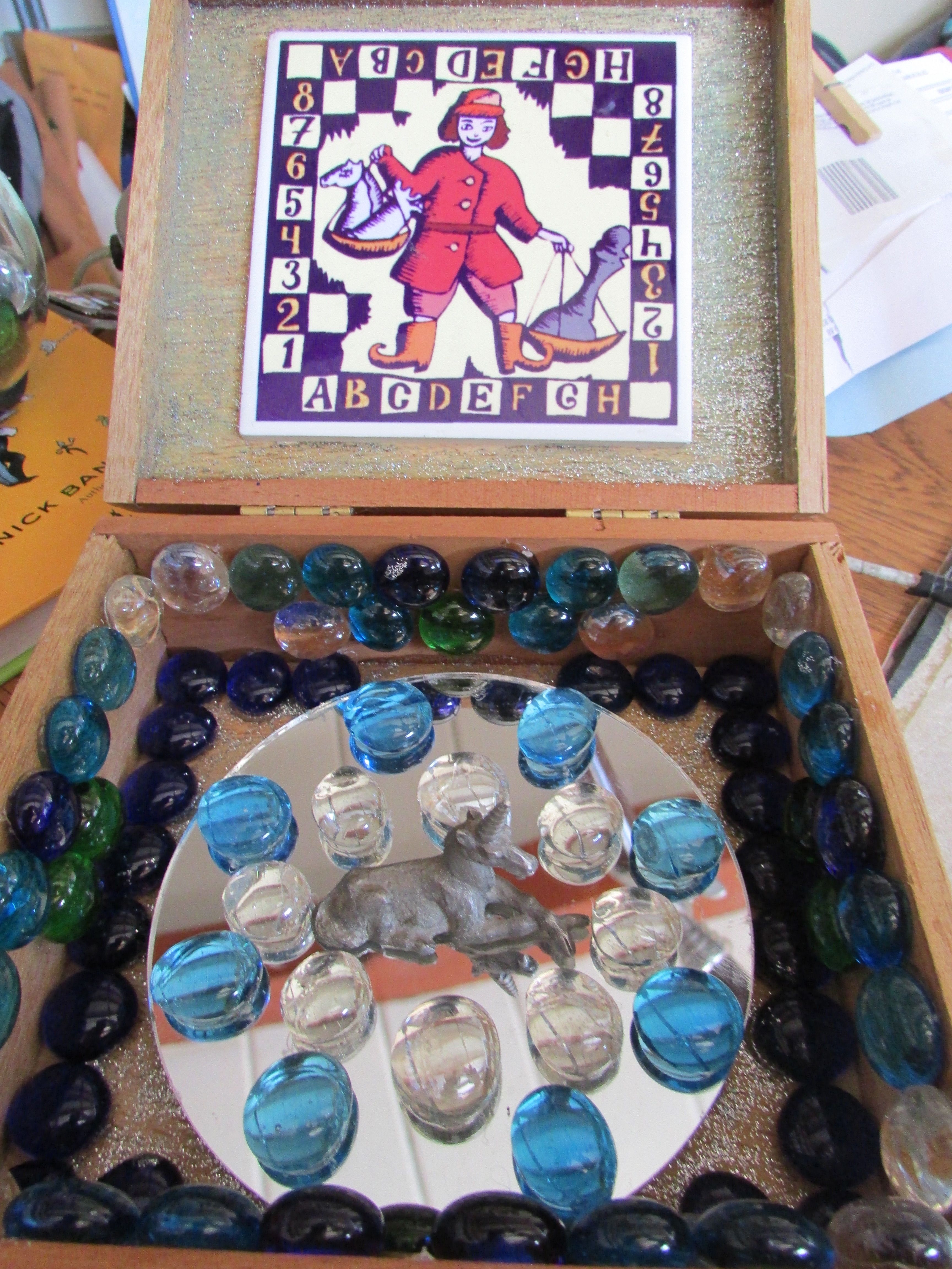 For the purposes of this exercise, I am a pewter unicorn, sitting upon a mirror, surrounded by colored glass, mounted inside a wooden cigar box, with a playful tile roof. The unicorn is chill and so am I.