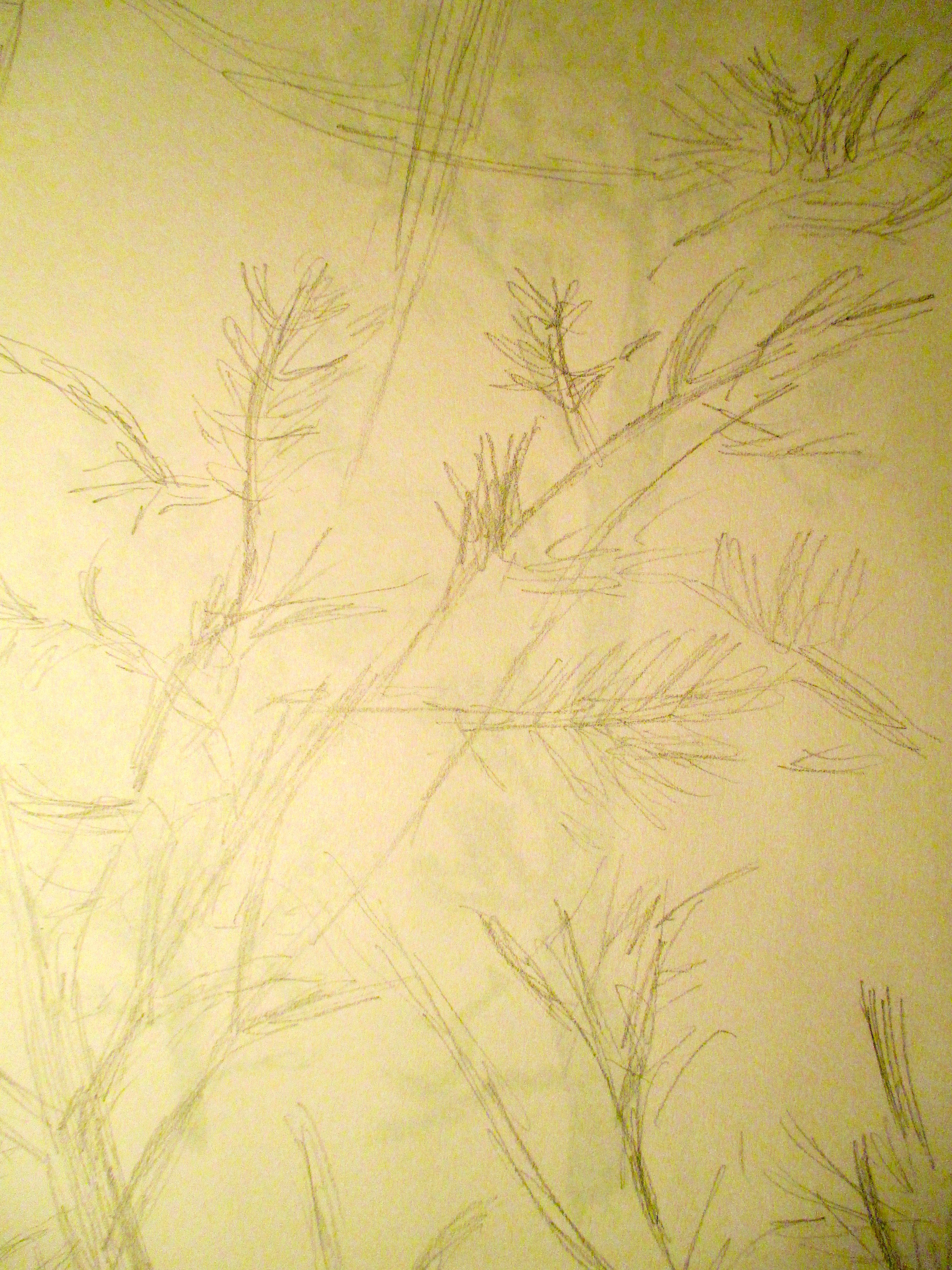 After I got frustrated with the first sketch, I mailed some postcards to my nephews and sat down in a different place, thinking of focusing on a smaller section of the landscape. Before I started, I noticed that the tree above me cast some interesting shadows on the paper, and I decided to just draw the shadows, as an easier exercise. My sketch is not quite as awesome as the shadows were, plus you can see through to the next page. Oh, well.