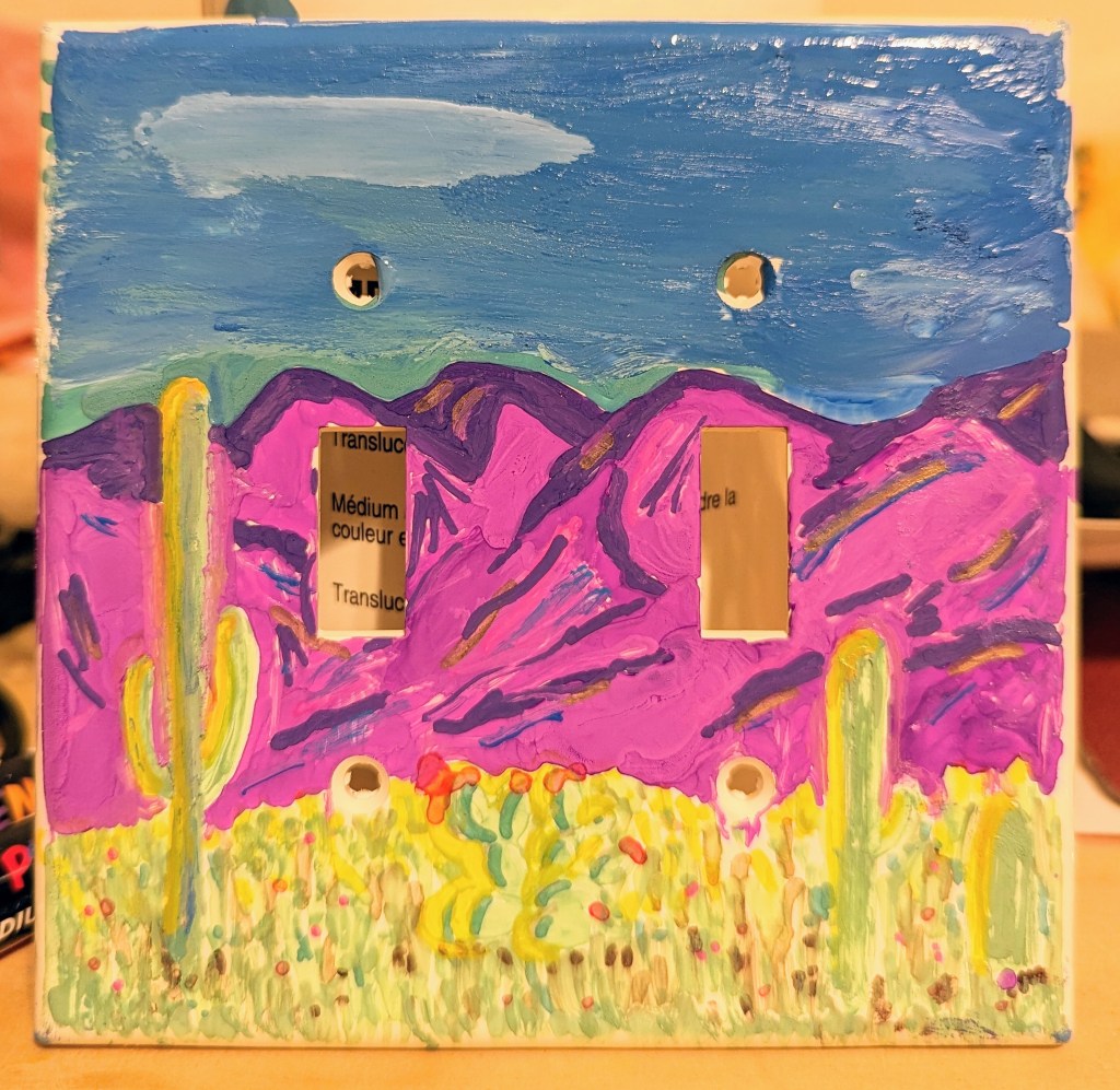 I’m painting a lot lately, and I am working on a bigger canvas all week: it’s about 4 feet high and 18 inches wide. Making a lot of progress and wasn’t done painting for the day, but I needed to let that project rest/dry, so I did another switchplate. I’ve been wanting to do this design for a while. Honestly part of the problem was that I couldn’t find a screwdriver. However, I persevered.