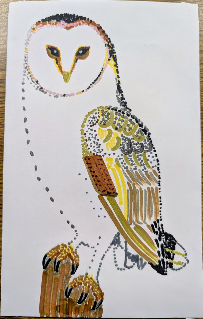 One of the GATE teachers liked my owl bulletin board so much she gave me a book called October, October by Katya Balen, which prominently features an owl, although that owl is a baby barn owl and my original owl was an adult great horned owl (inspired by a juvenile great horned owl). I wanted to make her a little owl card but baby barn owls are kind of ugly so I drew an adult.