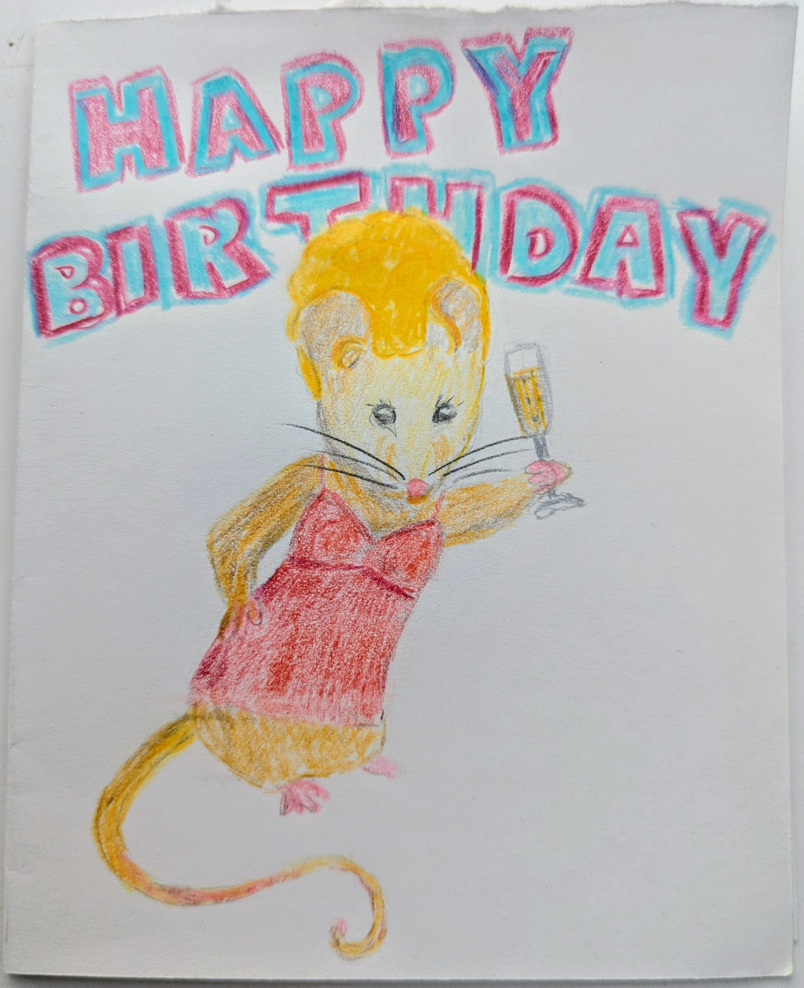 I went to a birthday party for the Coyote’s mom who turned 97! She was a famous beauty (literally) in the 20th century and she also was known for drawing little mousies, so I tried to draw this bombshell mouse in her style. Big hair, little red dress, and a champagne toast