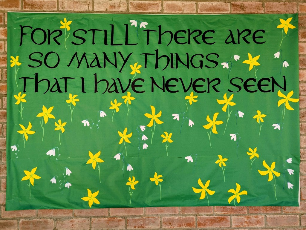 Even though this panel is the first of three, I did the image last.. The flowers and letters are cut paper but the stems and leaves are markers. The font is based on Aniron.