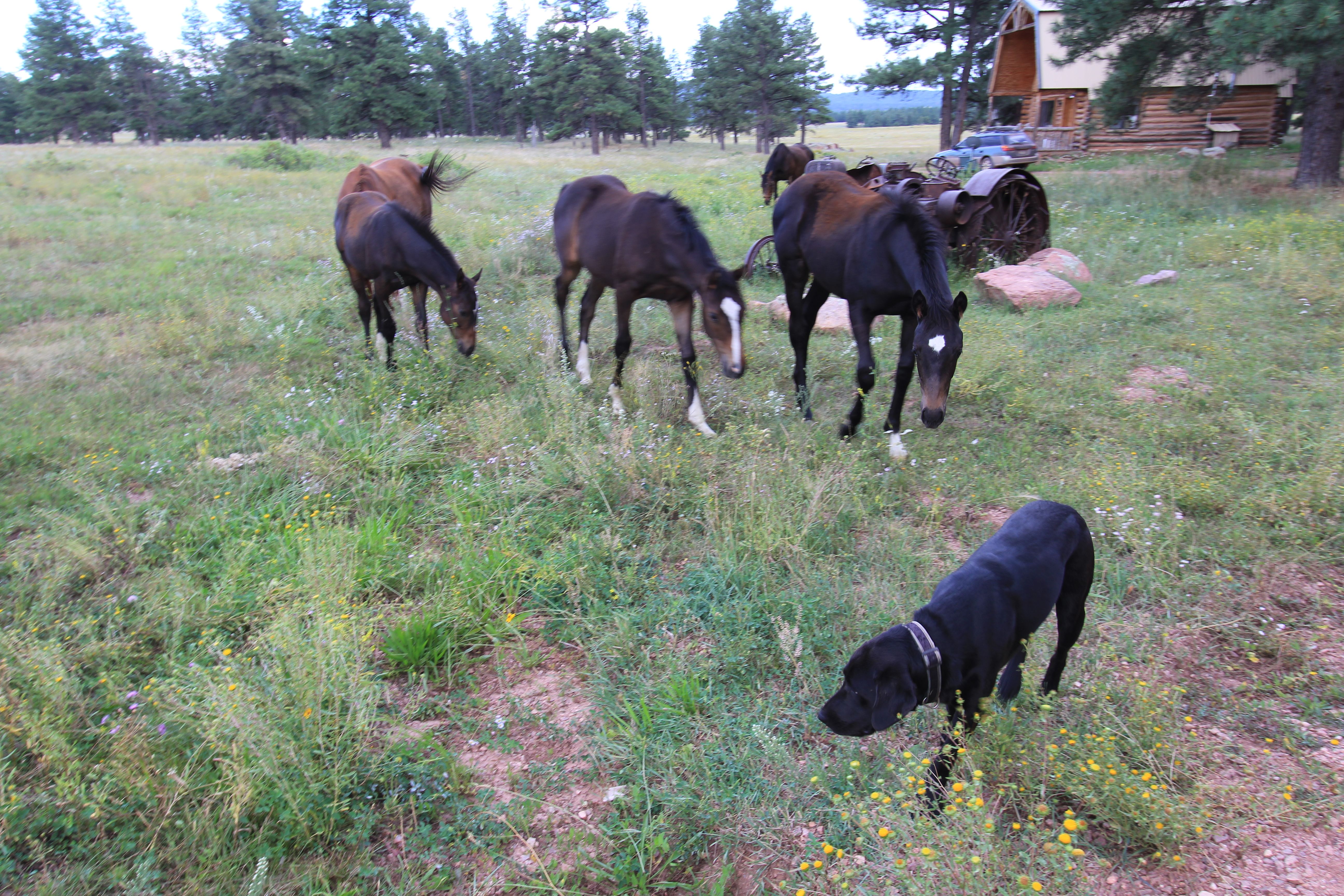 Anyway, the above image really communicates the general sense of where we are. We are staying in a cabin identical to the one in the picture (ours is next door). These horses come by every evening, chomping clover, and don’t seem to mind us petting them. The dog comes over every day and just hangs out. We took a long, rambling walk on Tuesday and she stayed near me the whole way. Even when she went after a jackrabbit, she came back to me. I imagine it must be incredibly boring for her when it’s not hunting season. Even though the Rabbit told me that labs don’t point, I swear this one kept pointing. I kept telling her I didn’t do that kind of shooting.