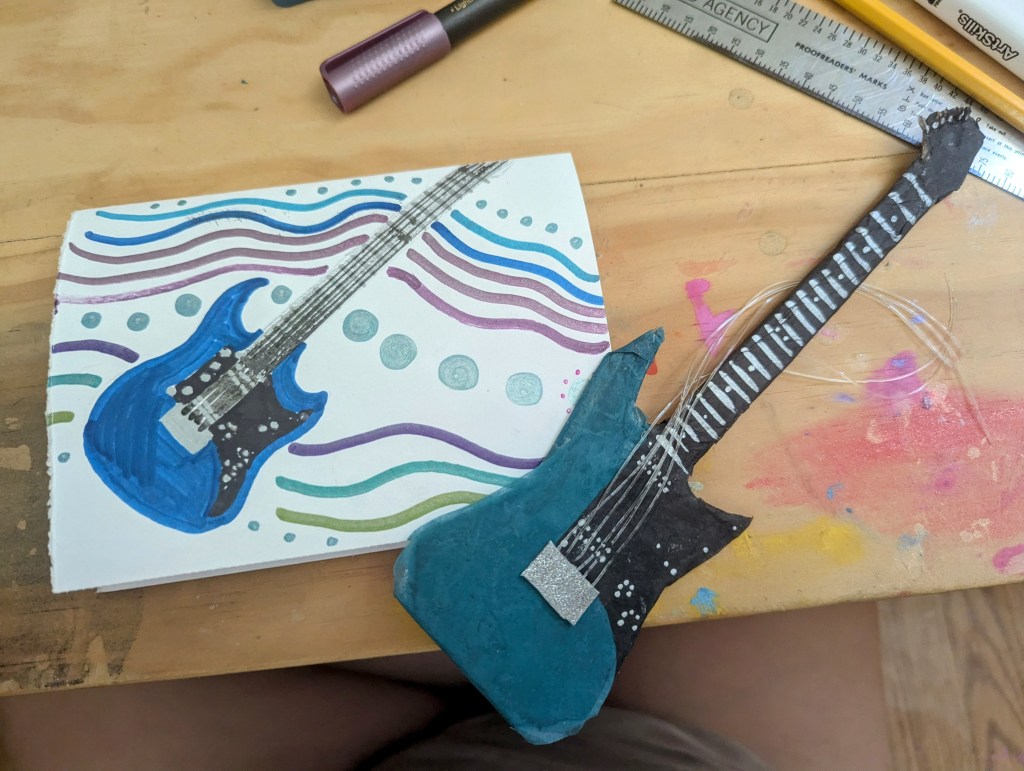 i spent 2 days trying to make nephling number 3 a 3-dimensional card with an electric guitar with real strings but I couldn’t find a satisfactory way to attach the strings and after the 7th time they fell out I gave up and drew a 2-dimensional electric guitar, which I am also not happy with. But camp is only 2 weeks long and if I didn’t actually mail them something they wouldn’t actually receive it.
