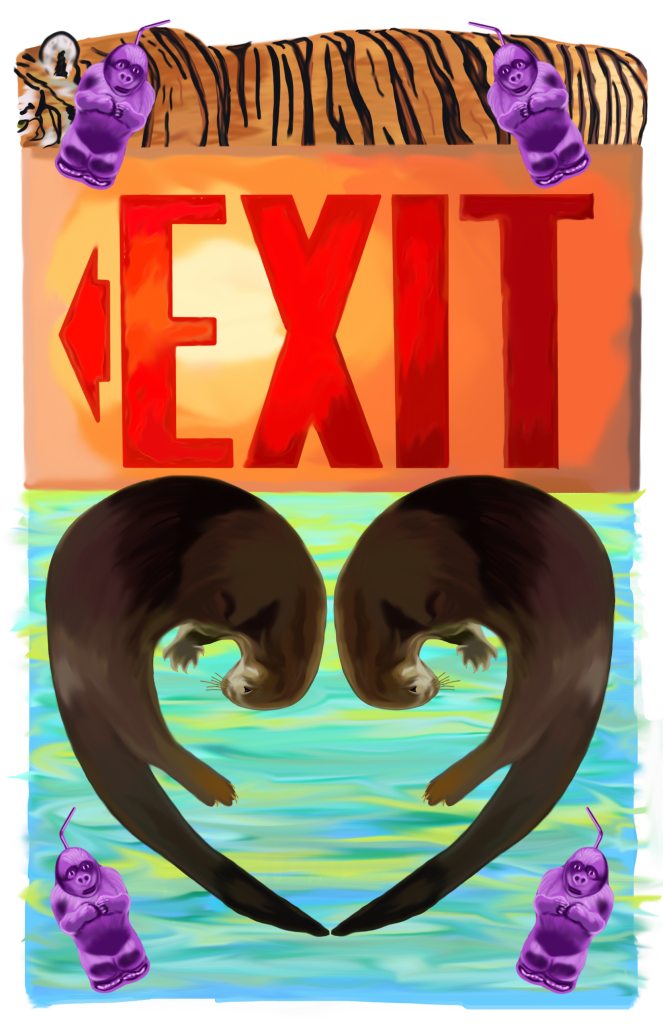 The otters are based on a photograph I took at the Arizona Sonora Desert Museum in 2022. He was doing these elaborate backflips every time he passed the underwater viewing window, and I saw the golden ratio in this one. My entire conception of the illustration was centered around that memory.