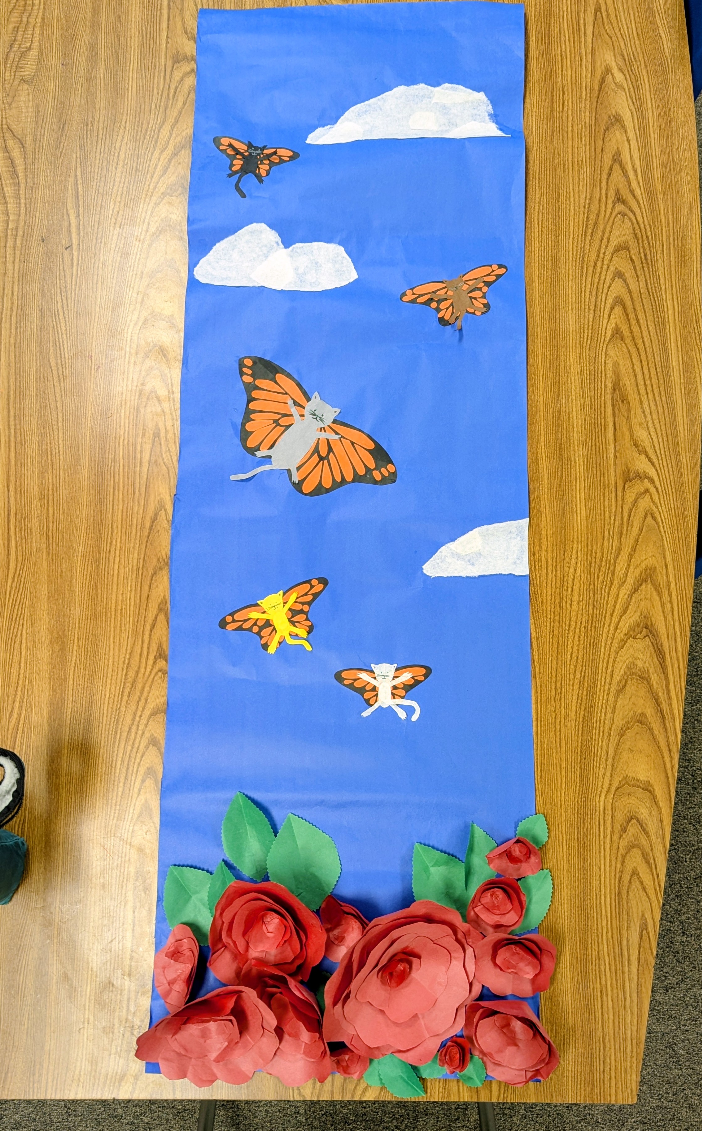 This banner was many weeks in the making, not because I spent a lot of time working on it, but because i spent so much time working on other things. There’s a lot to do in a library. So I stayed late twice this week and, I confess, cannibalized the flowers from another project completed some years back. Sometimes I save pieces of old bulletin boards. That saved a lot of time.