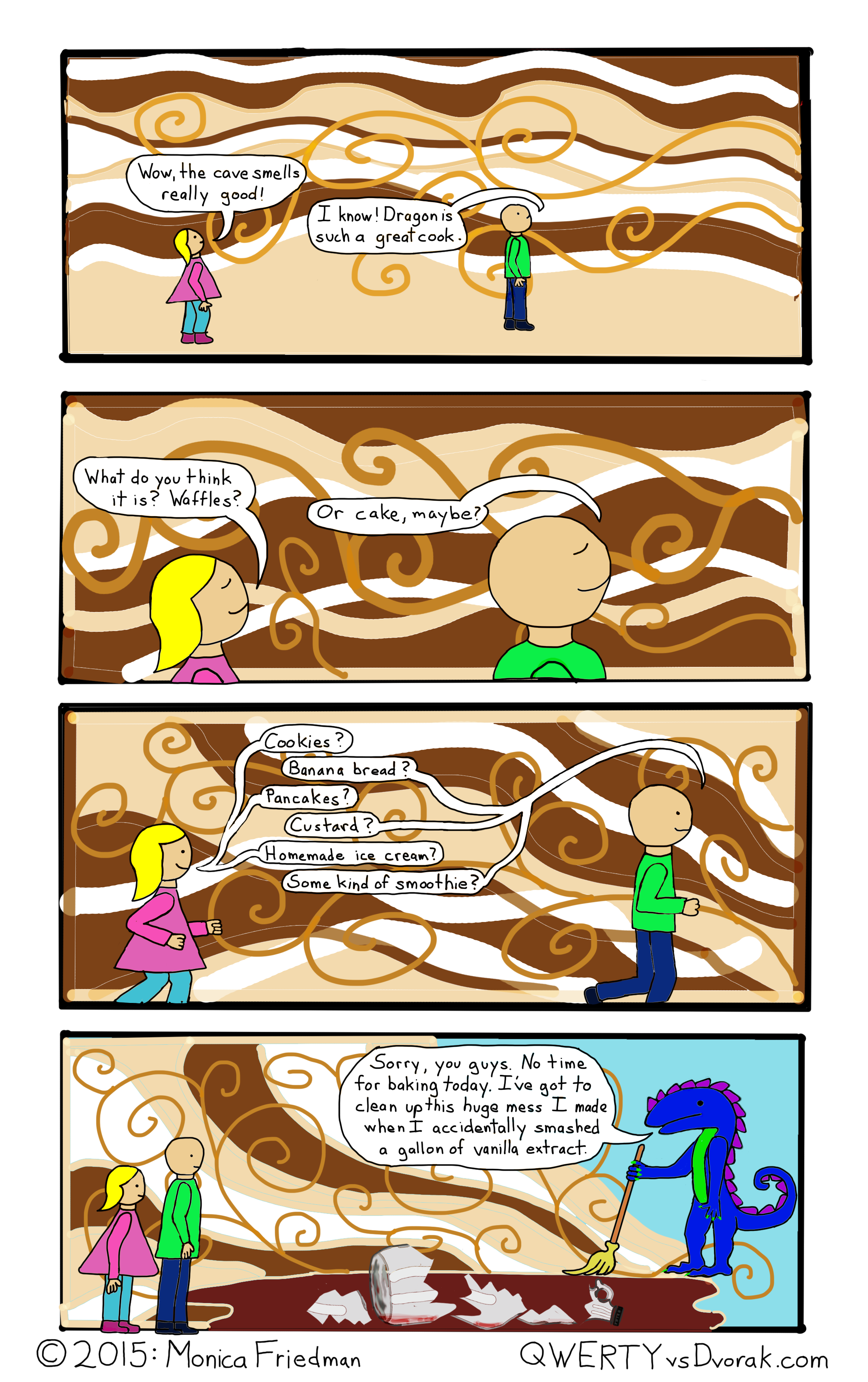 Honestly, as I was finishing this comic, the kids were in the kitchen without me, baking a cake, which they are able to do more or less on their own at this point in time. The gag came to me when they weren’t even here. They are really connoisseurs of vanilla and double it every single recipe they make, meaning the kitchen smells like a bakery when they made a half recipe of waffles. They already had churros and banana bread today, but The Man is also a sugar junkie and he gave them permission. I don’t really bake at all anymore, except for birthdays and such.