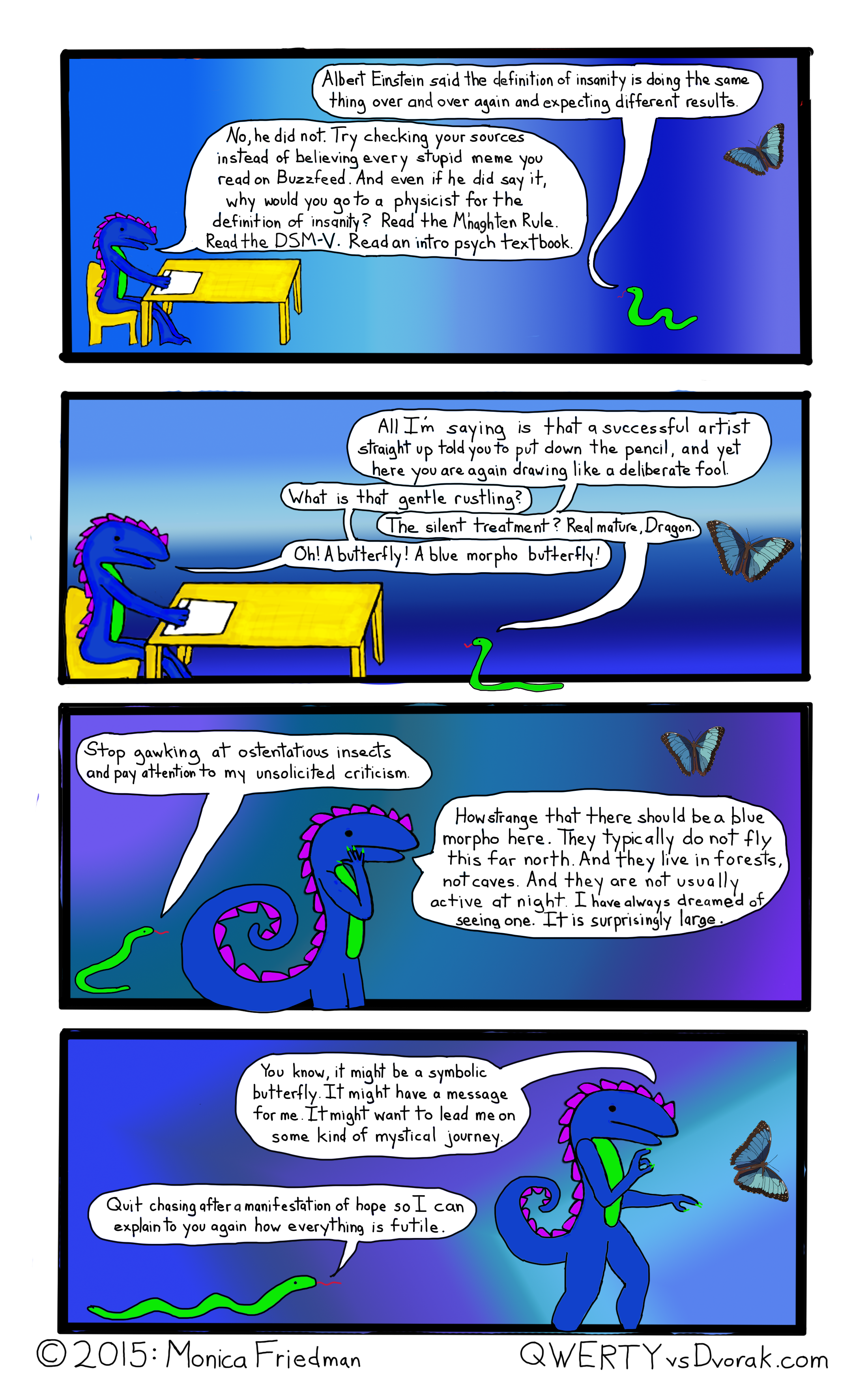 I really like that butterfly, visually as well as psychologically. It’s based off one in the butterfly house at the Tucson Botanical Gardens, and there will be a more detailed version on a T-shirt, most definitely. The way Dragon creeps after it in panel 4 is pretty adorable as well. In real life, you can’t really follow a butterfly. You’re better off sitting very still and giving it the chance to to come to you. It helps if you wear bright colors.