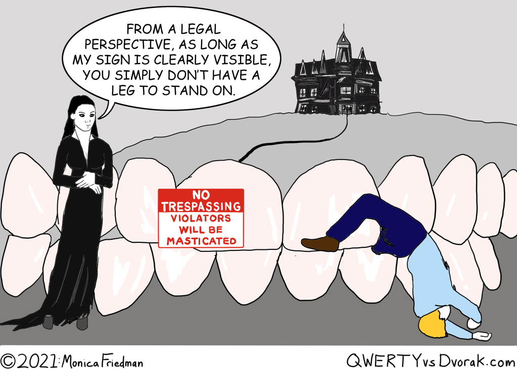 It started, I suppose, with my morbid but not the least bit irrational fear of having a metal bit drilling into my skull while I am conscious to experience it, which morphed into a generalized and perhaps slightly irrational phobia of dentistry in general, which I have been working to overcome for the last couple years. And then there’s the component where my lawyer friend told me that if you dont have a “No Trespassing” sign up, then it isn’t illegal for people to trespass on your property. Even if you have a wall of giant teeth surrounding it. Without the sign, you could be liable for the trespasser’s injuries. With the sign, you’re protected.