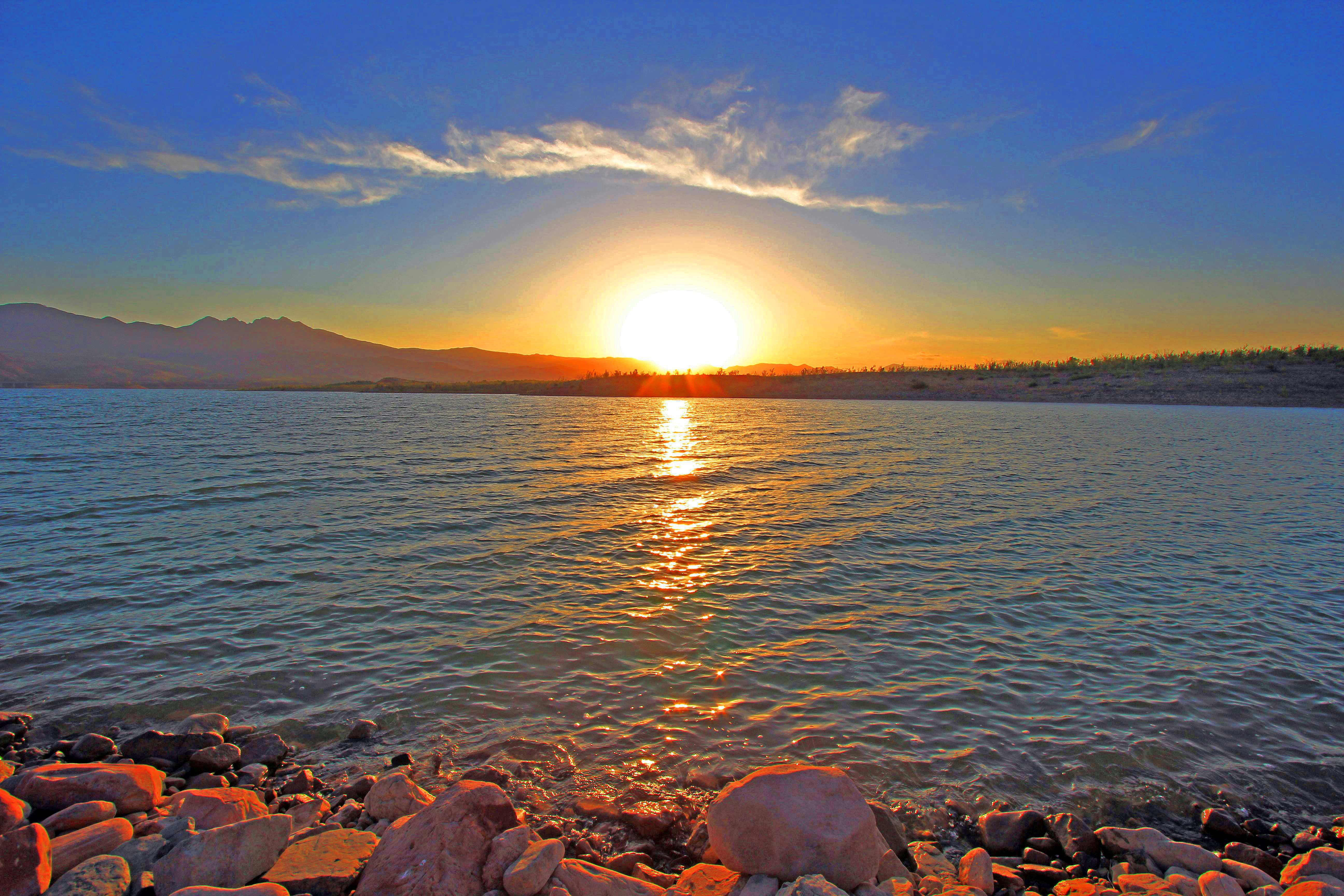 The Man and I watched this sunset, and I’m certain that every moment was dazzling, and that the stones on the lakeshore truly did glow in the golden light of the setting sun. And yet, the original photograph was flatter than memory. Then I messed with the levels in Photoshop; now the stones glow. Still, did they glow to that degree? The sky probably wasn’t quite so blue, and of course the sun was sharper.