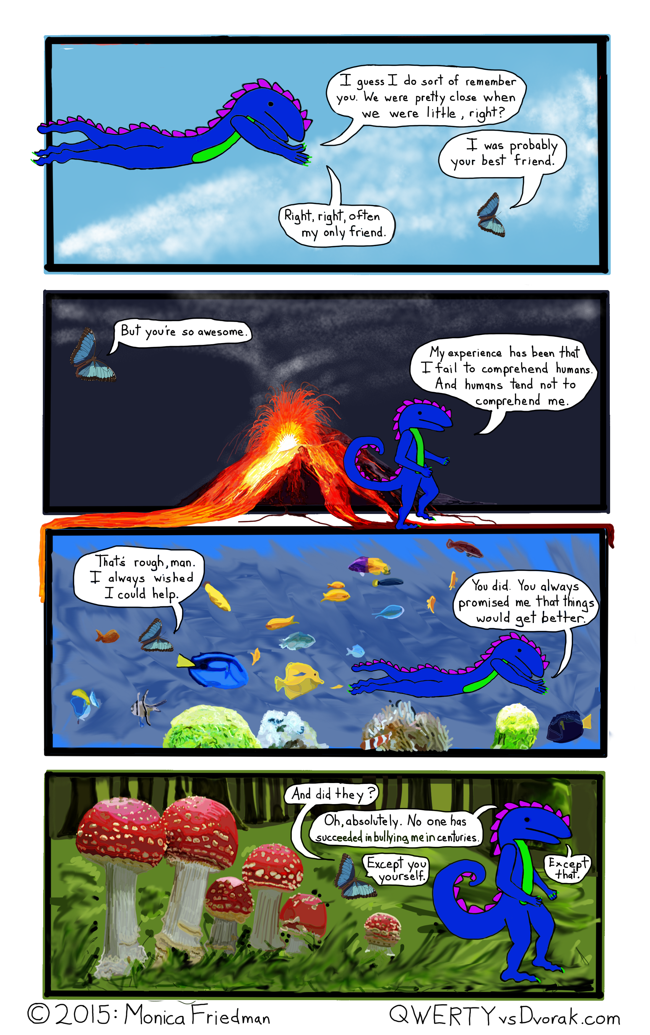 When I was as student at Antioch College, hotbed of radicalism, “You’re weird,” was offered as a compliment and received as such. The response to, “You’re weird,” was, “Thank you.” A lot of people blossomed and became themselves at that time, in that place. But most folks I know, then and now, suffered tremendously at the hand of the majority in the years before college and spent our young adulthood working through it. While discussing last week’s comics with a friend, she revealed a story about how a teacher responded when she complained of being bullied that frankly horrified me; regardless of what I went through, I never had a teacher deliberately compound my suffering, or appear to enjoy it. (Although I certainly felt bullied by certain teachers at certain times, this story was simply cruel, particularly as it occurred in response to a cry for help.)