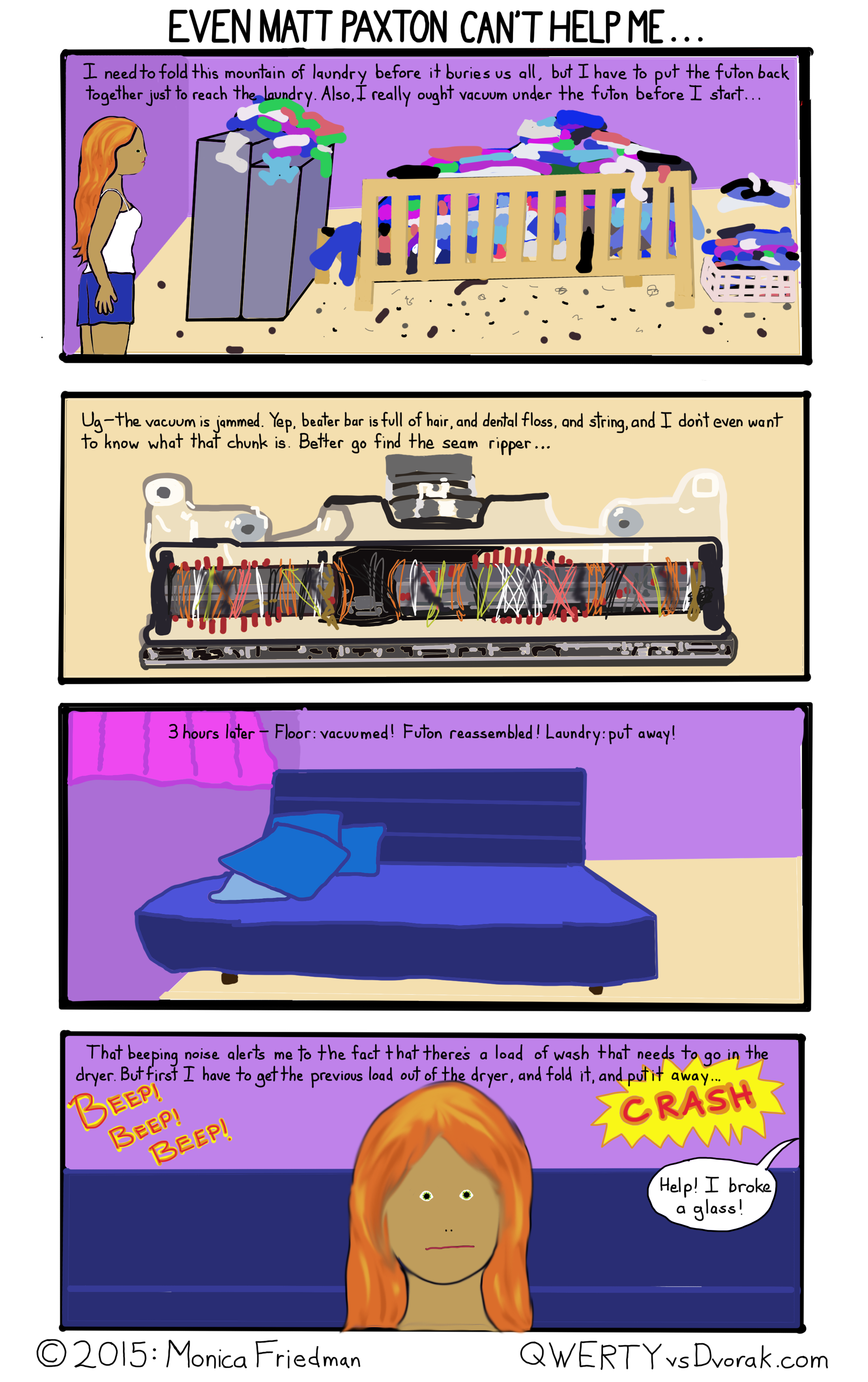 Usually the words come before the images, and this comic was no different. When I start drawing, sometimes I put the words into the file first, just so I could see how much space they would take up, but for this comic, there weren’t that many words, and I was feeling very out of sorts, so I wanted to get the more complicated part out of the way before I lost my eye hand coordination and ability to focus. So, I saved the dialog for later, and once I had the black and white outlines I started to wonder if it could be equally, or possibly even more entertaining, as a silent comic.