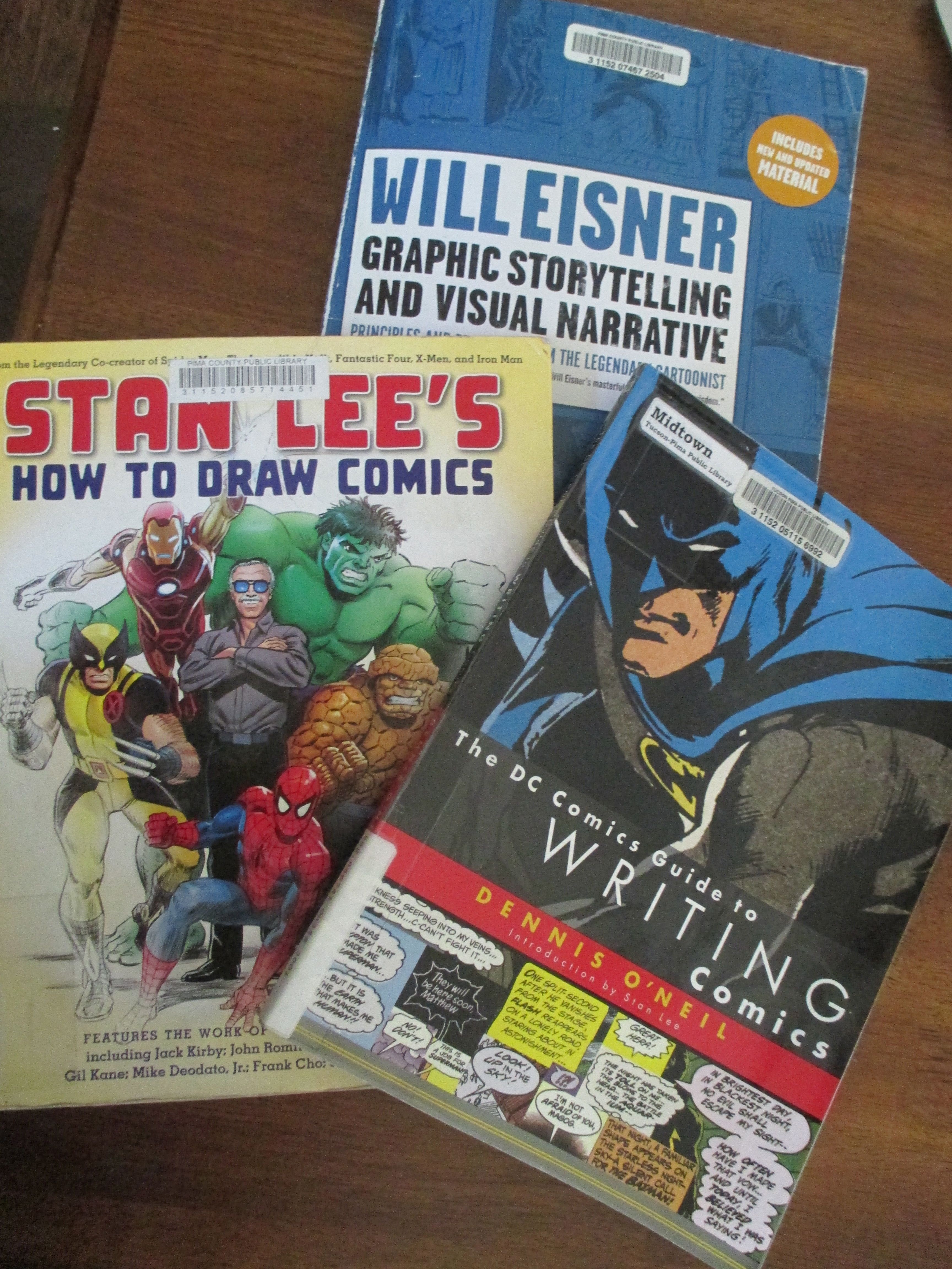 Lacking the time or money for a low-res MFA in graphic storytelling, I’ve been reading voraciously on the subject. The DC Comics Guide to Writing Comics by Dennis O’Neil has by far been the most useful resource on the subject, answering many questions about how to draft a script, and how words and images relate to one another in this format. Stan Lee’s How to Draw Comics is massive and detailed, offering excellent advice for artists. I’m still working on the Will Eisner book; although I’ve not got very far into it, it definitely offers a very different perspective and set of advice. Eisner basically invented the modern graphic novel format.