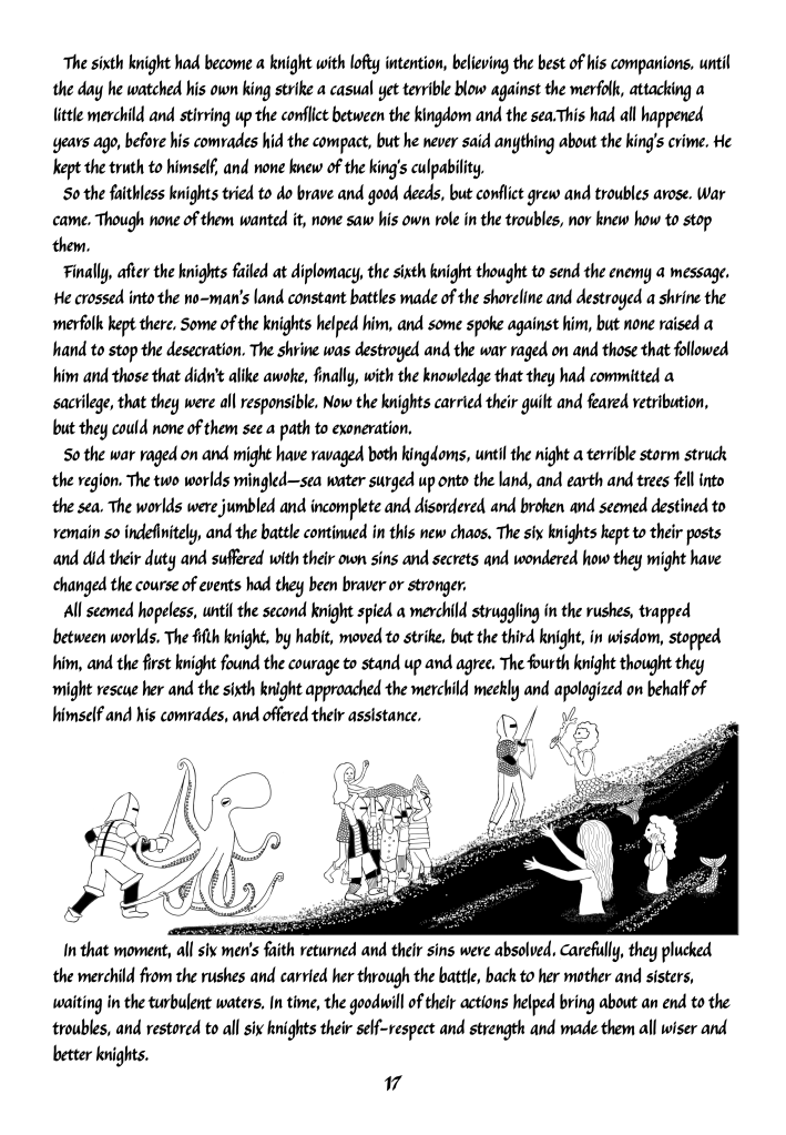 This is the story that’s probably going to do the least for a reader who hasn’t actually read the book, and required the most careful note taking on my part, so I could really get a sense of each of the six “knights” and what they specifically had to be sorry about.