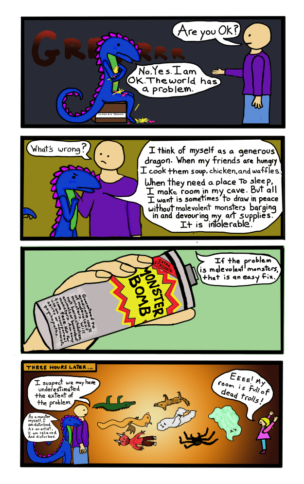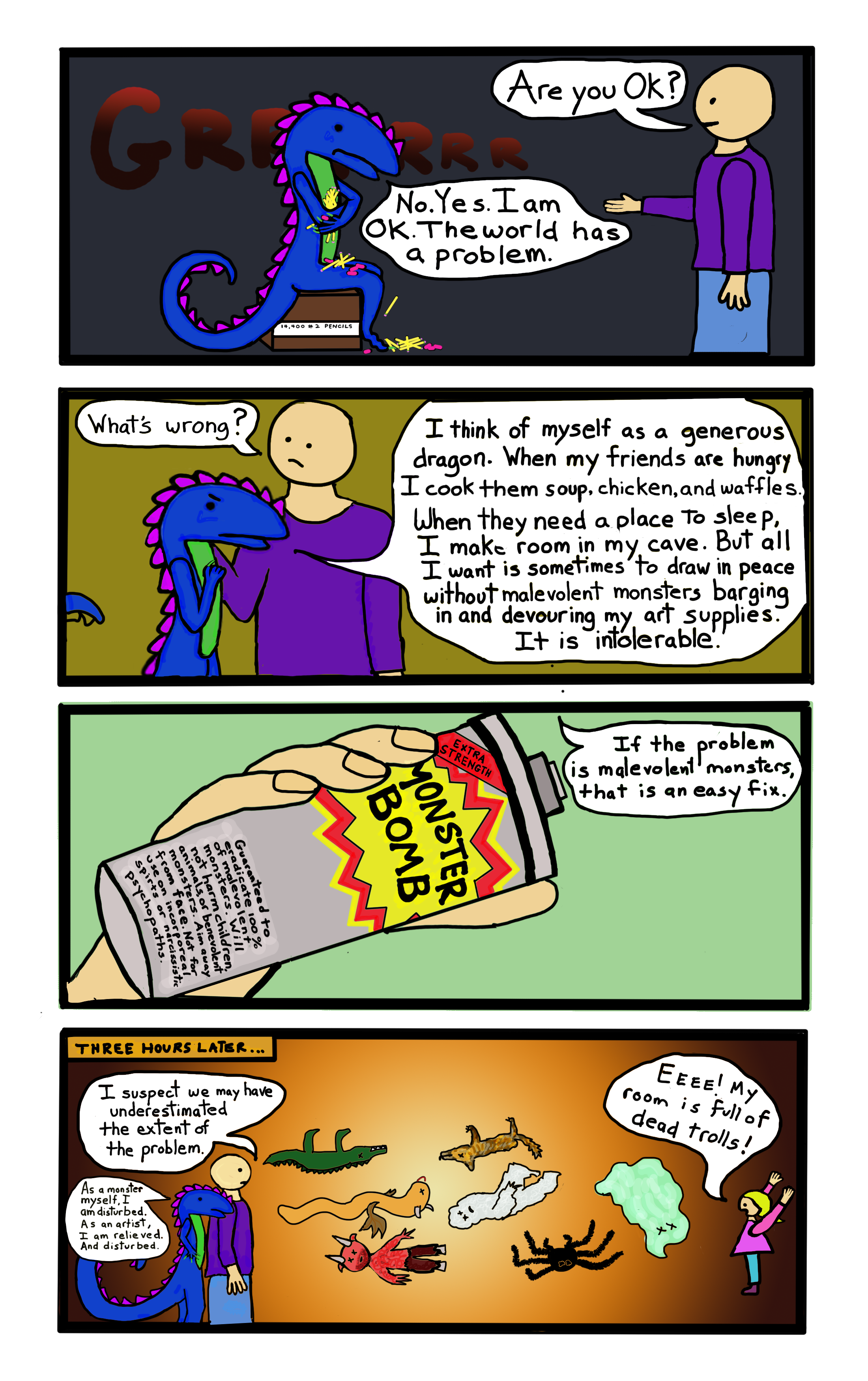 You know how it goes. You get busy, you let the chores pile up, you step away for a couple days, and before you know it, everything’s gotten away from you and the cave is infested with buzzing, flying demons. Every single time. A dragon can’t get a moment’s peace. How are you supposed to create something beautiful in that environment? How will dragon escape this mess? Besides cleaning up, obviously.