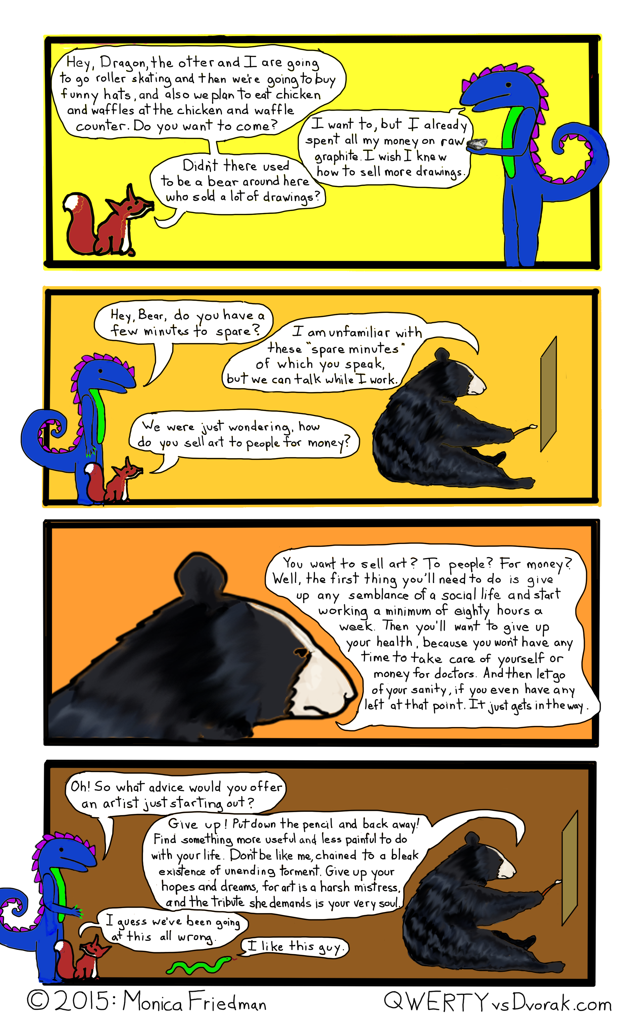 This comes out of two things. One is that, knowing my tendency to second guess myself, I try to force myself go with the first thing and then worry about it until given reason to stop. So, when I drew yesterday’s comic, the thought crossed my mind that something that came to me in a dream might not be a good idea in the waking world, but I went with it anyway and then spent all night worrying that it was too dark, too grotesque, too confusing. And then people related to it anyway. (That’s supposed to be panel 2 from yesterday’s comic in panel 3 of today’s comic but it’s probably too small to see.)