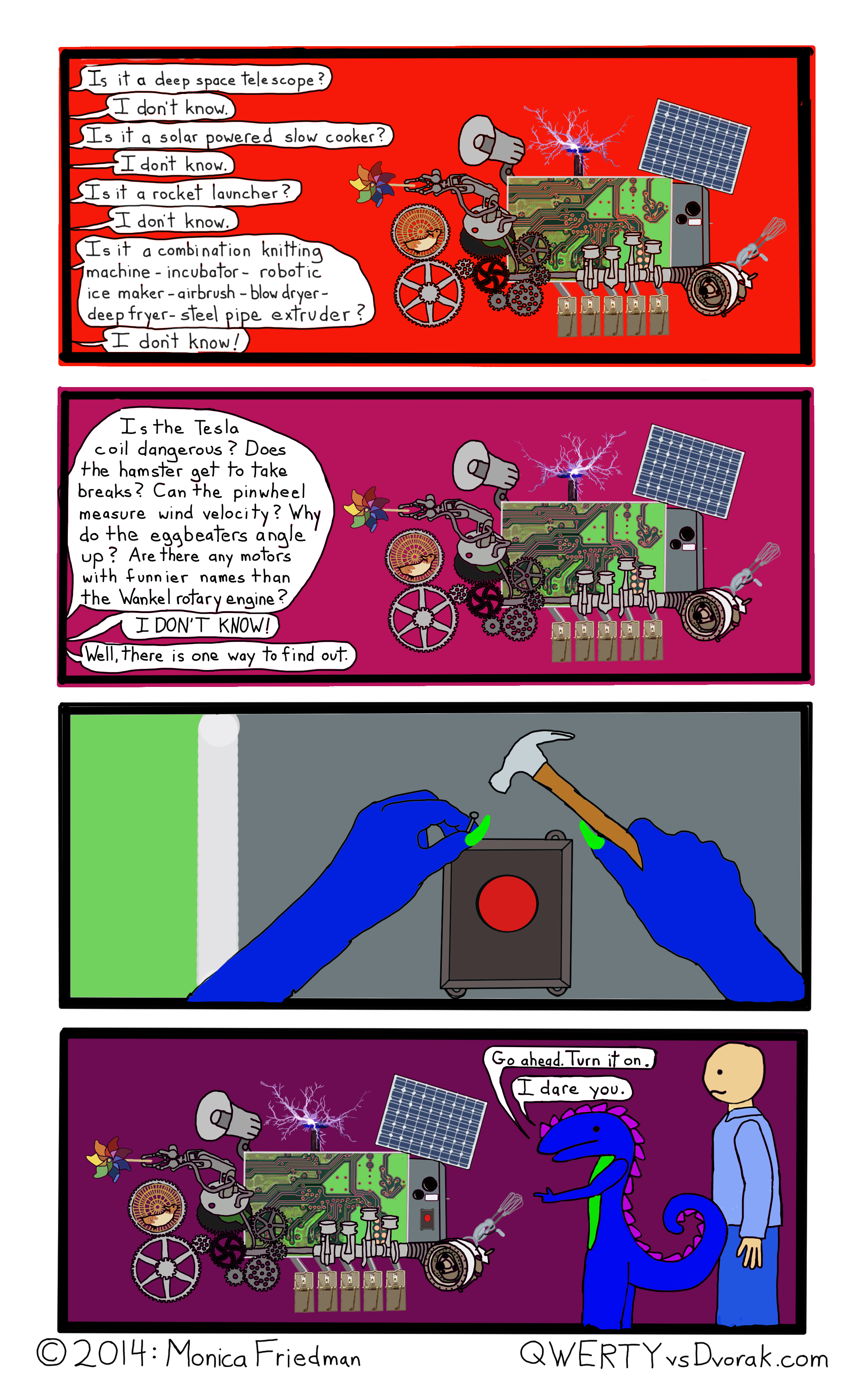 At any rate, a machine this powerful probably can’t be destroyed, although it can be stored in the guest bedroom with all the craft supplies and exercise equipment you never use, buried under antique furs and baby toys and ugly prints inherited from long-dead great-aunts. Dragon’s Cave, unlike my house, offers unlimited storage space, so there’s no question of setting the machine on fire on the front lawn.