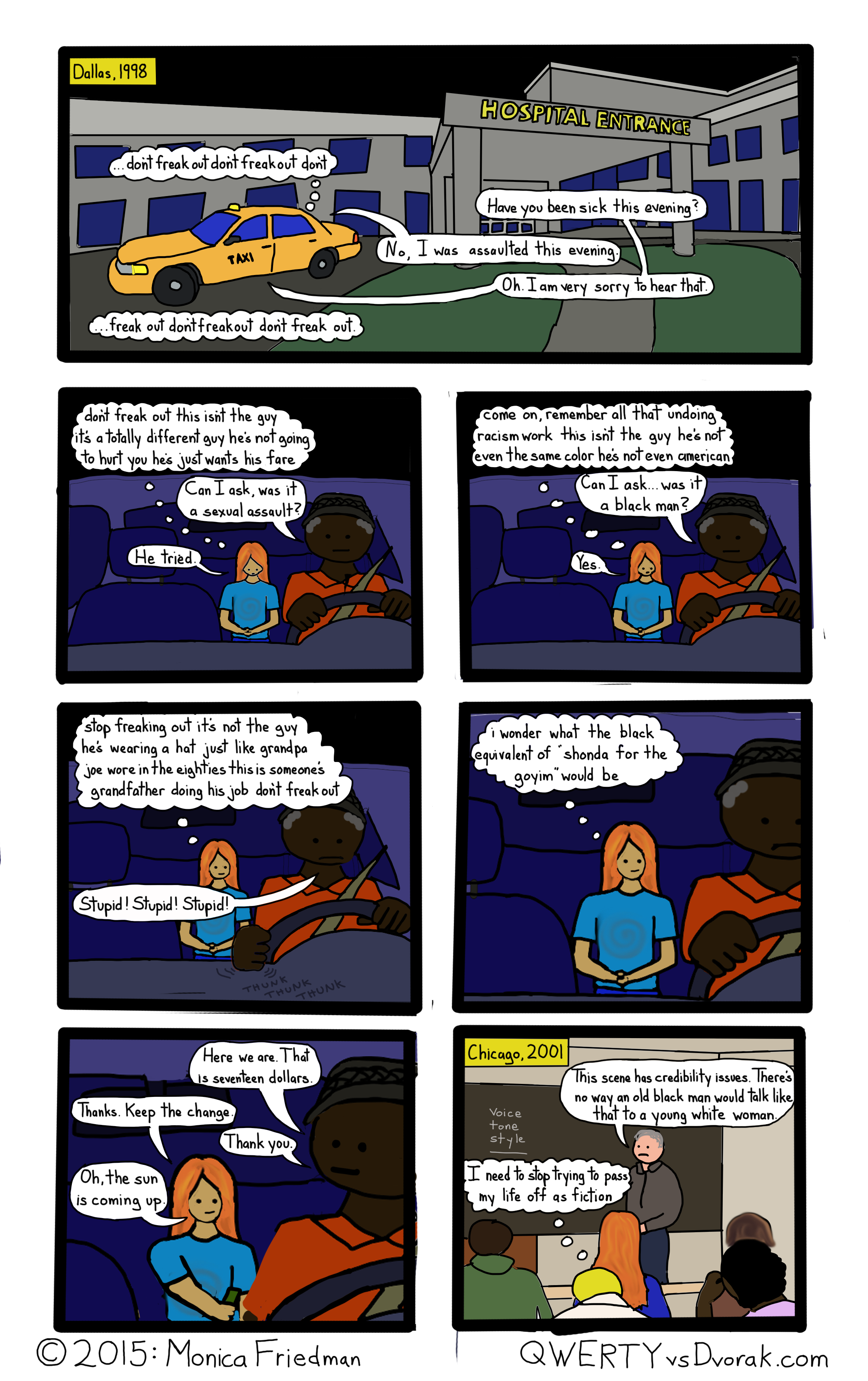 Another thing we can do in comics, which is more difficult in print (but not impossible, if our text is digital) is quickly scan for information. Picking out the most important symbols made the themes of each story pop out from the page, so it was easy to create a graphic interpretations of those themes (see graph), but after I did so, I realized that basing the graph on the comics presented, of course, my own bias. I drew far more metaphors for women’s bodies than I drew the visual and physical assaults on those bodies. In the books, the assaults outnumber the metaphors. Sometimes, I had to look away, because the stories were so immersive, in their way, that the rural noir world of Campbell’s Kalamazoo threatened the world I live in, a world in which I have so much privilege that it’s possible for me to look away, even as I’m intentionally fixing my gaze on the subject.