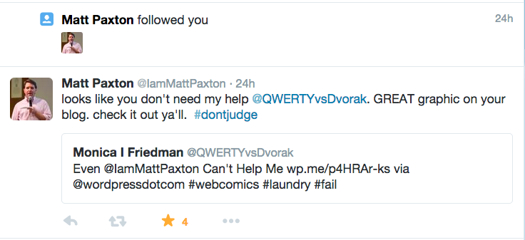 Some fun things: last night the actual physical human being Matt Paxton, a guy whose wit and wisdom I have enjoyed for a number of years on the horribly voyeuristic and schadenfreude-tastic reality show Hoarders, saw my comic in honor of his superior organizational abilities and retweeted me with a compliment.