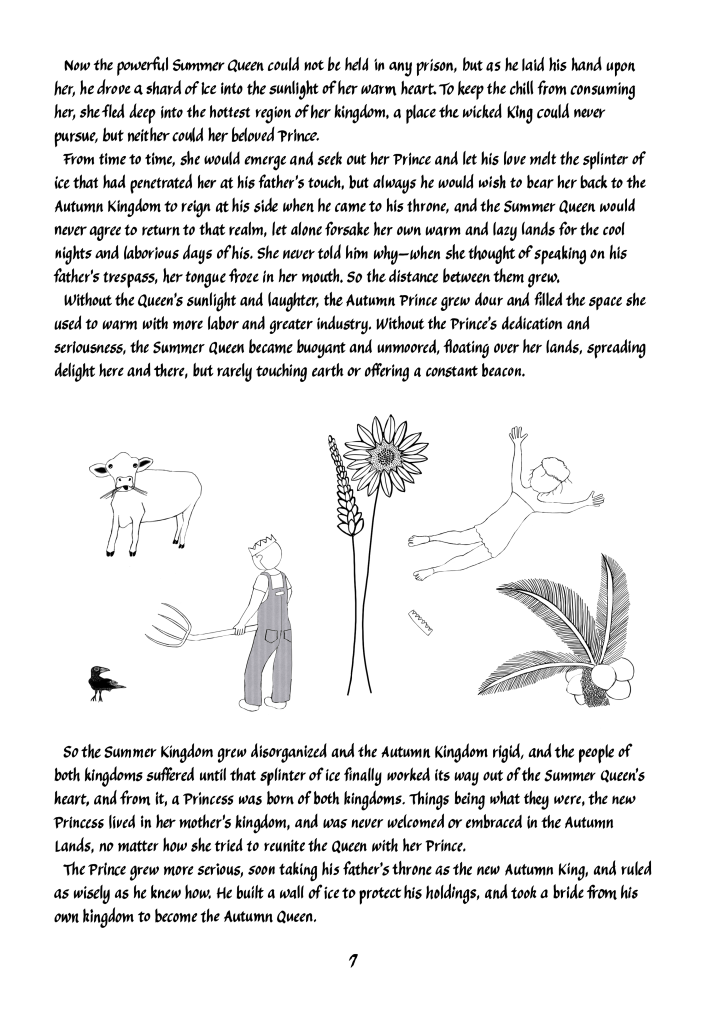 I originally had bigger plans for this page, but I scaled them back once I got the main details. It was saying pretty much what I wanted it to say, but something did seem to be missing on both sides. On the Summer Queen’s side, I realized it had to be her losing her crown, but on the Autumn Prince’s side I couldn’t figure it out. I mean, it could have been some bits of hay? But that is not very interesting.
